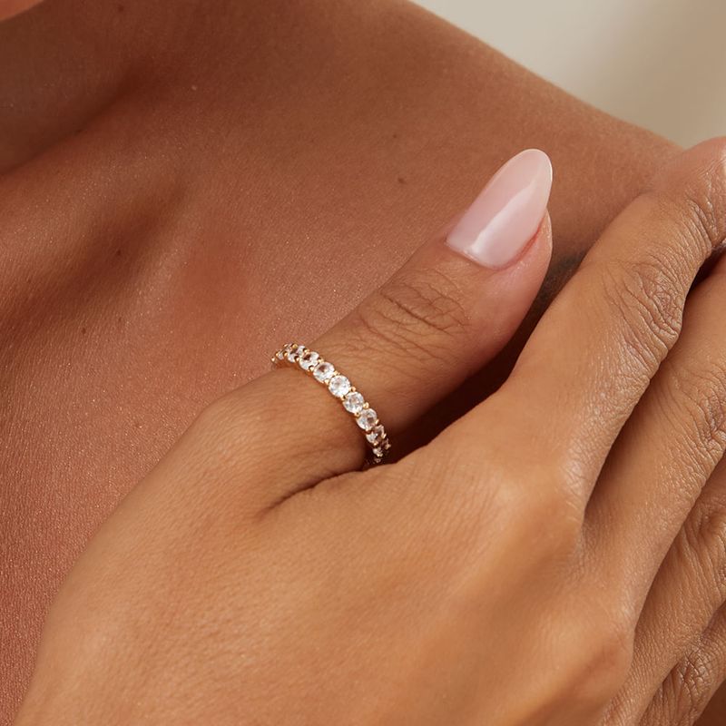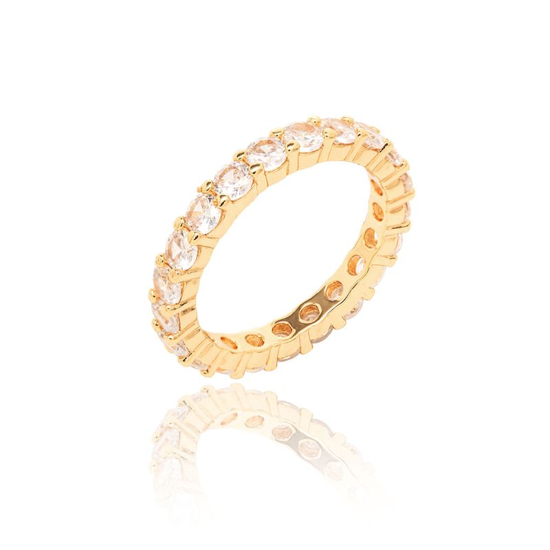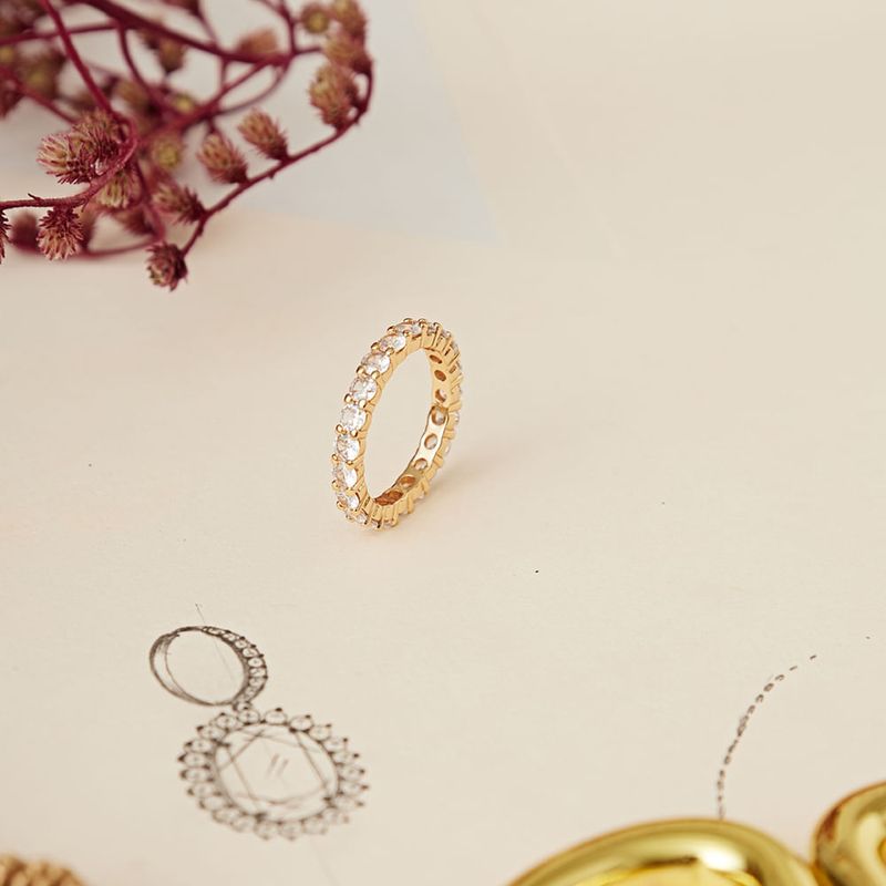 O anel aliança com banho de ouro 18k encanta pelo design de redondinhos cravejados com zircônias brancas. Um clássico repaginado que mistura brilho, elegância e modernidade. Ideal para compor looks sofisticados ou ser usado em mix de anéis cheio de estilo.