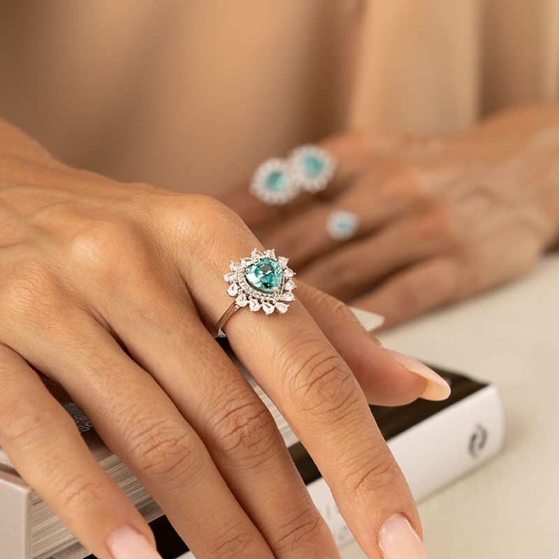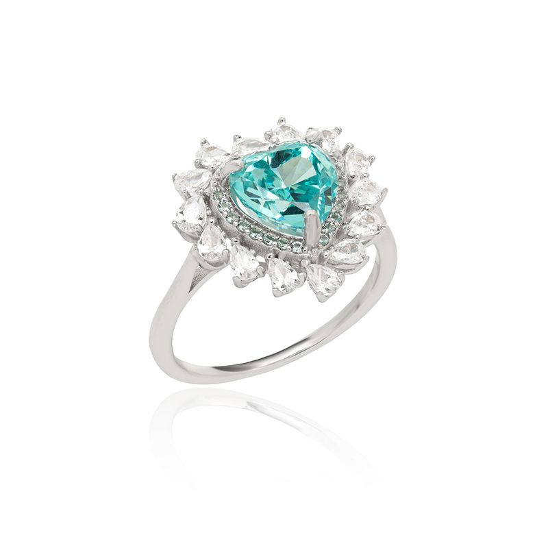 Anel Coração Crushed Ice Cutting Sky Blue e Zircônias Brancas 5A - Prata 925