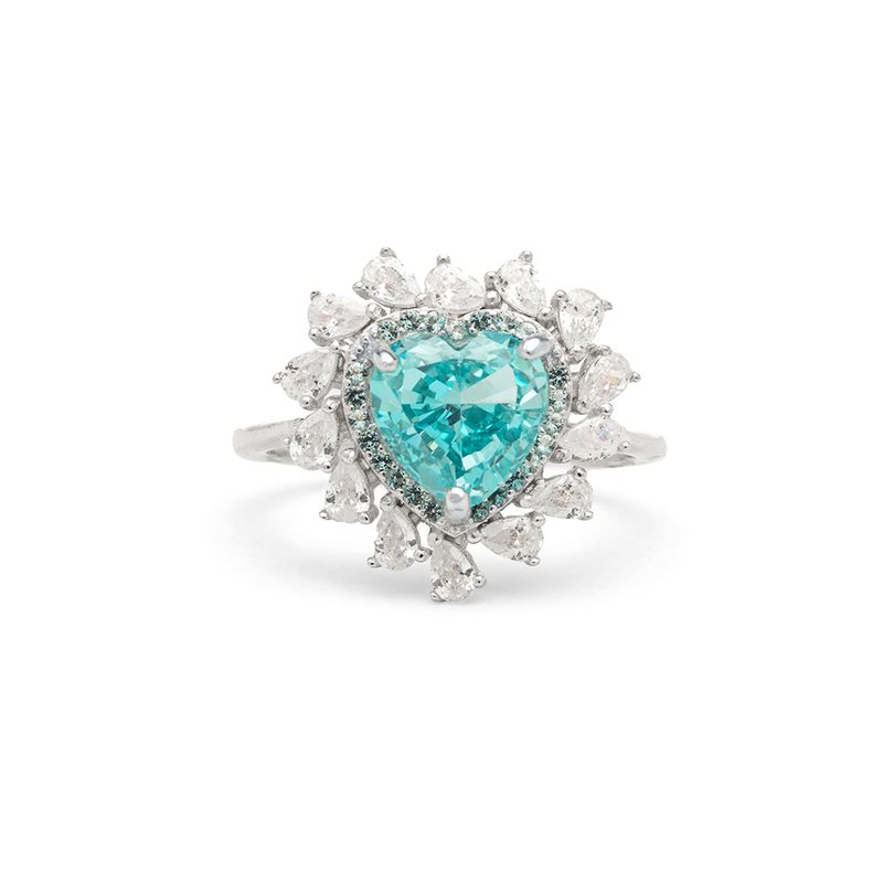 AnéisCoraçãoPrata 925Anel Coração Crushed Ice Cutting Sky Blue e Zircônias Brancas 5A - Prata 925