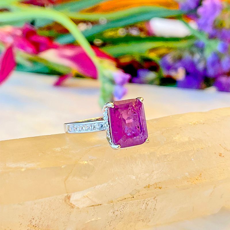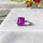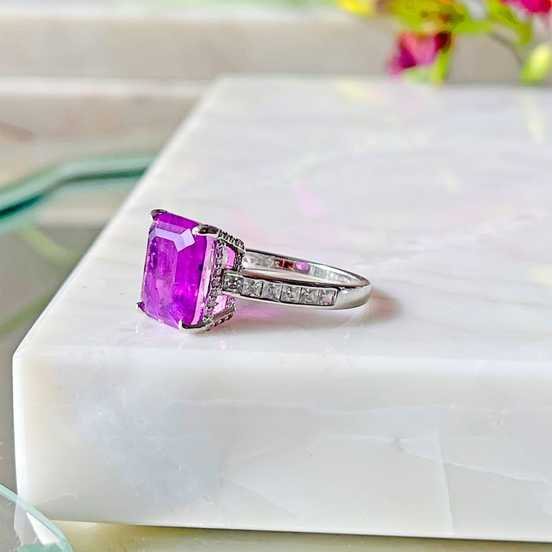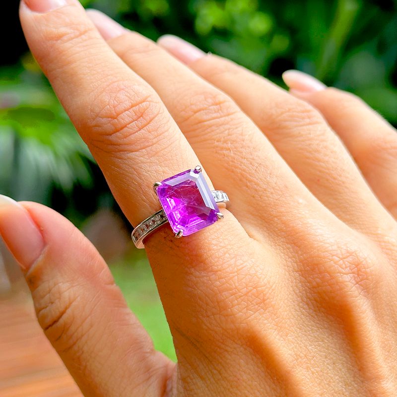 O anel da coleção traz um conceito inspirado nos solitários com fusion ametista retangular e aro cravejado de zircônias brancas.