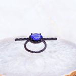 Anel oval banhado de ródio negro possui fusion safira ao centro e pequenas zircônias cravejadas como se fosse uma linha.
