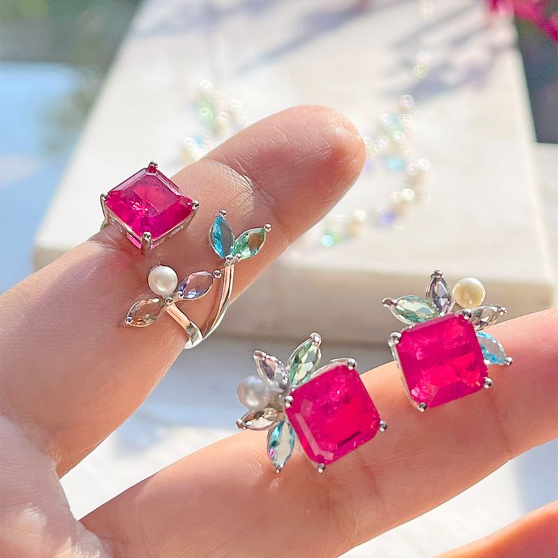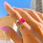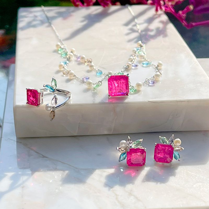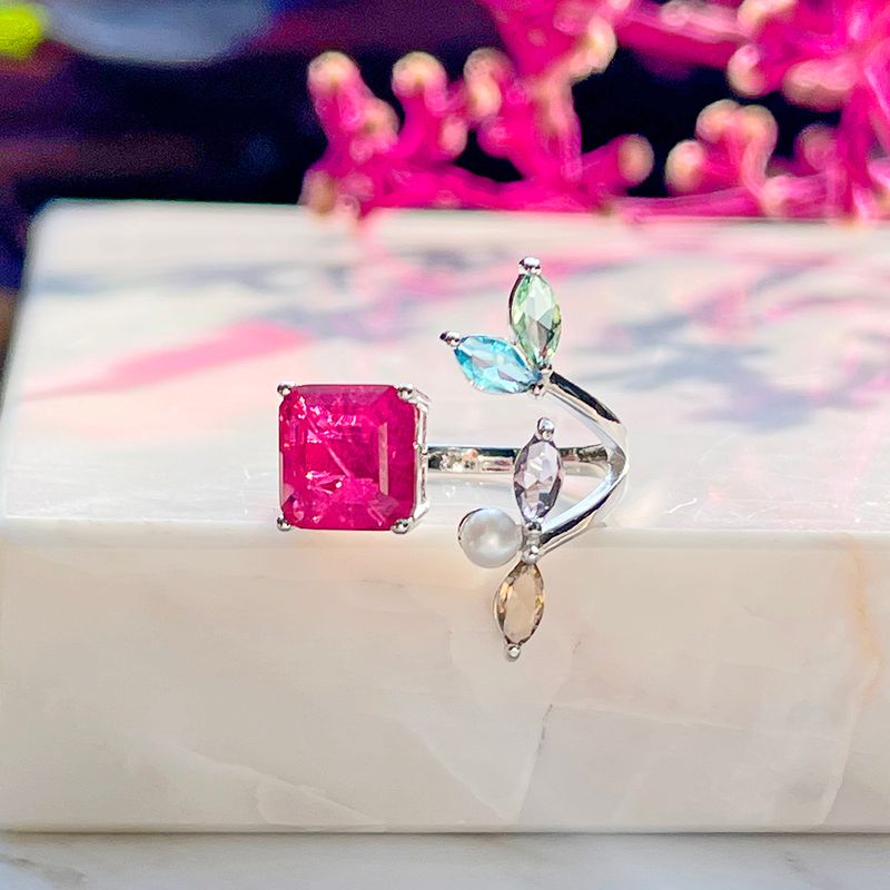 Com design moderno, o anel de prata 925 vem fusion turmalina rosa quadrada com cristais de topázio azul, pérola e ametista verde.