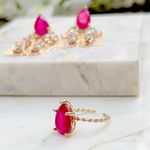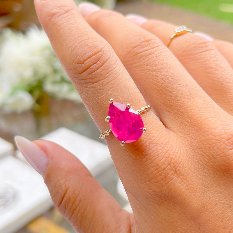 O anel banhado a ouro 18k vem com gota de fusion turmalina rosa e aro trançado. Além disso, a sua cliente pode ajustar tamanho, pois o aro possui uma abertura.