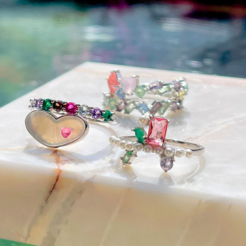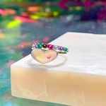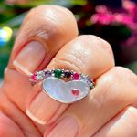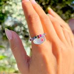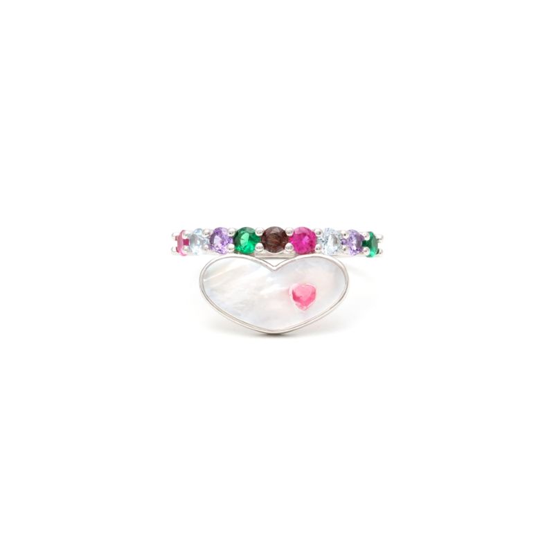 O anel de prata 925 contém coração de madrepérola e aro cravejado de cristais de rubi e ametista. Destaque para o coração esmaltado no detalhe da madrepérola. Confira mais opções de joias de prata para sua loja. Garanta novidades no estoque e conquiste suas clientes!