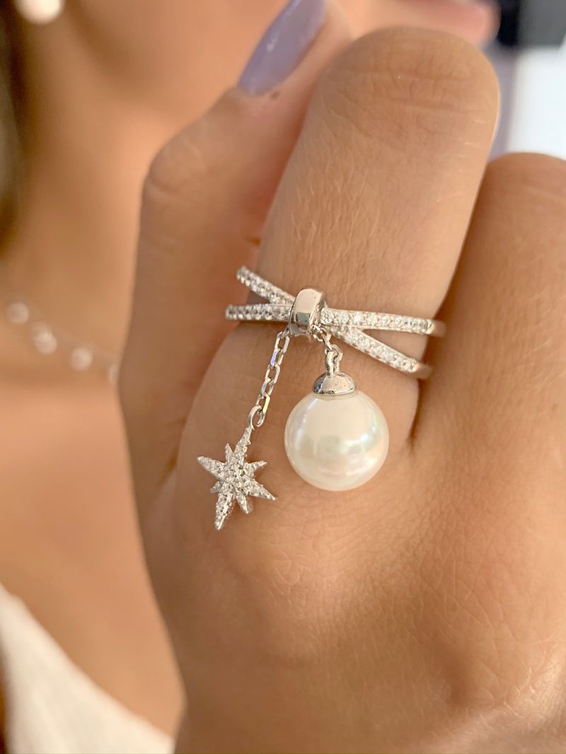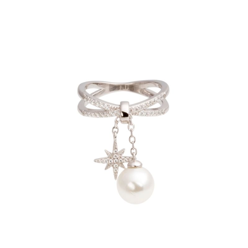 Anel perola zirconia branca estrela 8 pontas pendurada aro17