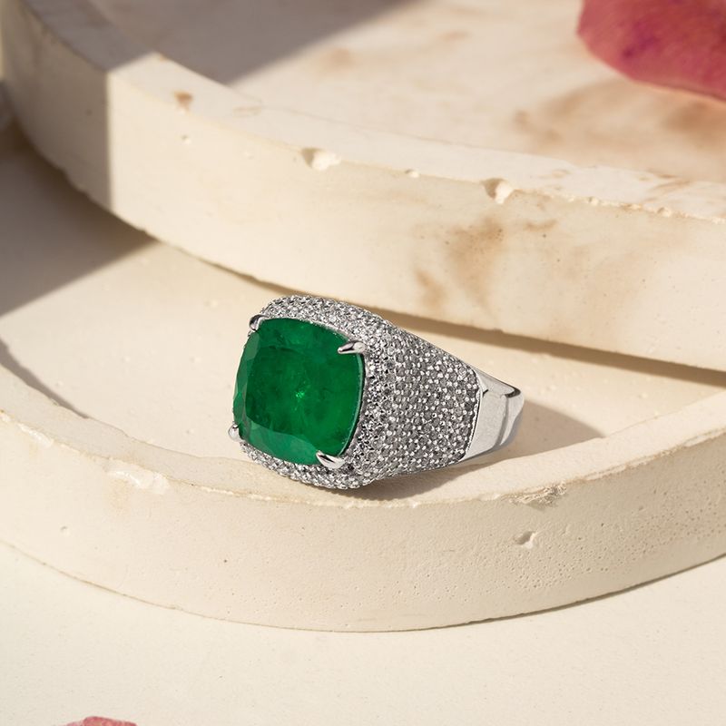 Anel Quadrado Bordado de Fusion Esmeralda e Zircônias Brancas - Prata 925