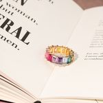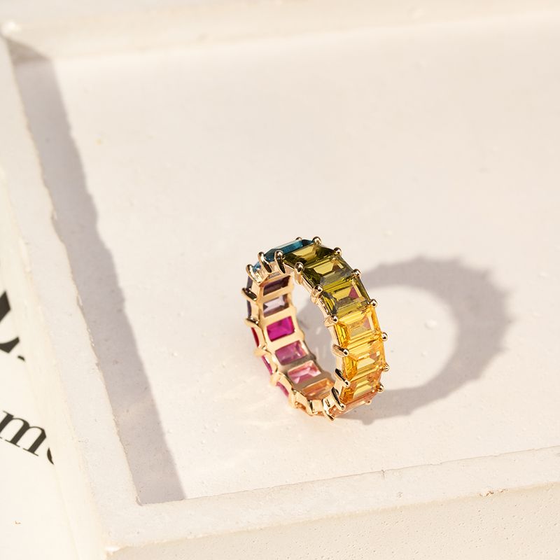 O anel Rainbow Aliança em banho de ouro 18k é puro charme! Os cristais retangulares de Citrino, Peridoto e Turmalina Rosa formam um arco-íris moderno, alegre e cheio de estilo. É aquele anel que deixa o look mais iluminado, delicado e com um toque de cor super divertido e elegante.
