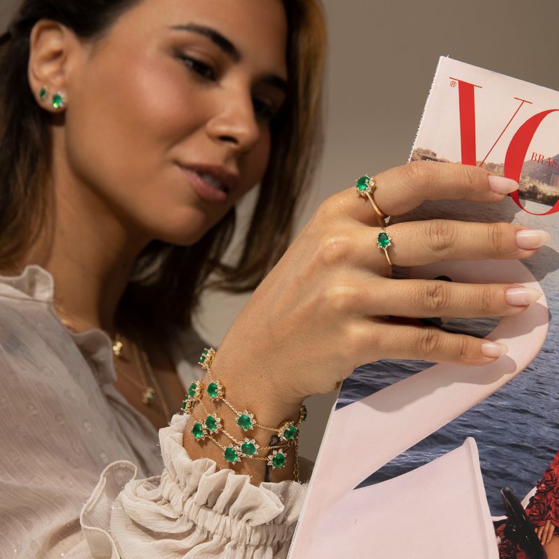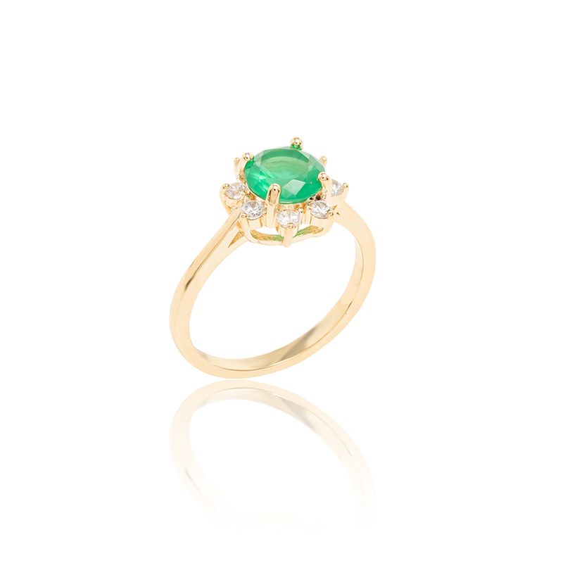 Anel Redondo com Cristal Esmeralda e Zircônias Brancas - Banho de Ouro 18k