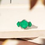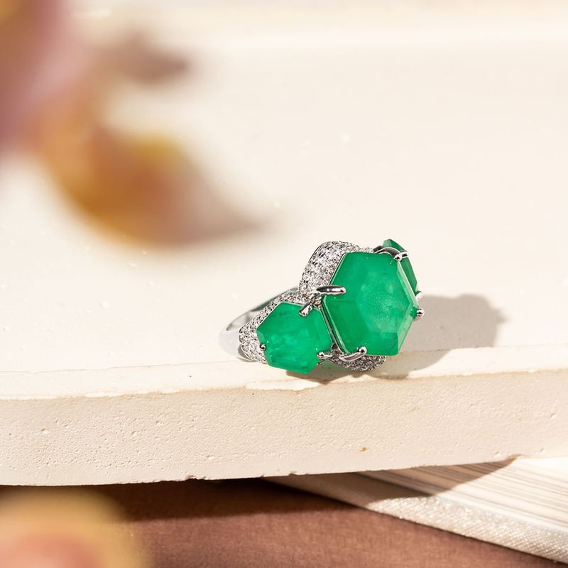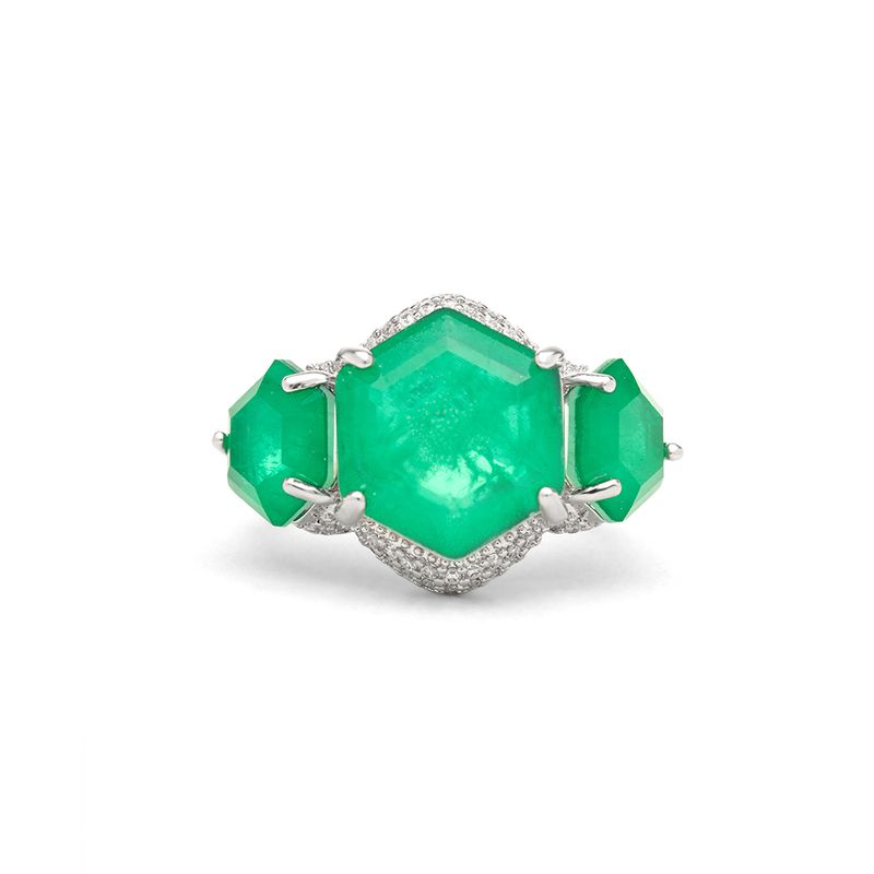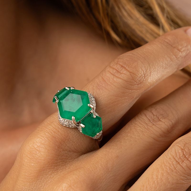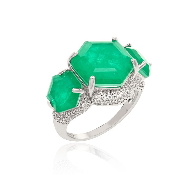 Anel Sextavado Fusion Esmeralda e Zircônias Brancas - Banho de Ródio Branco