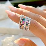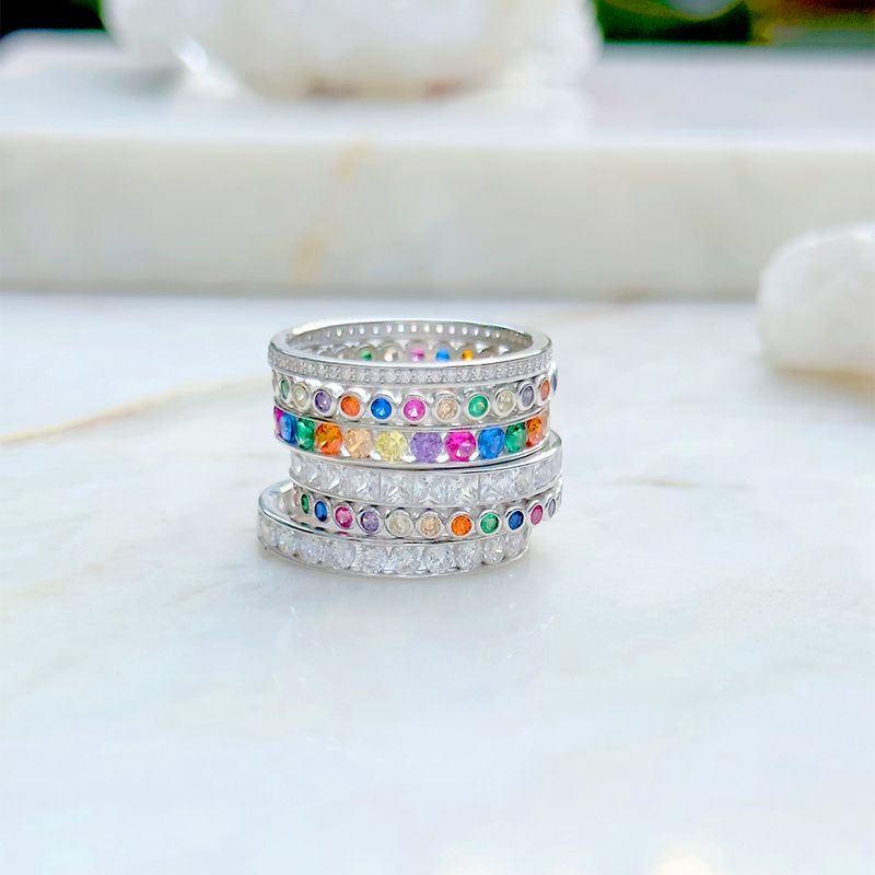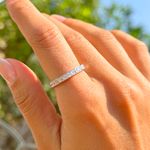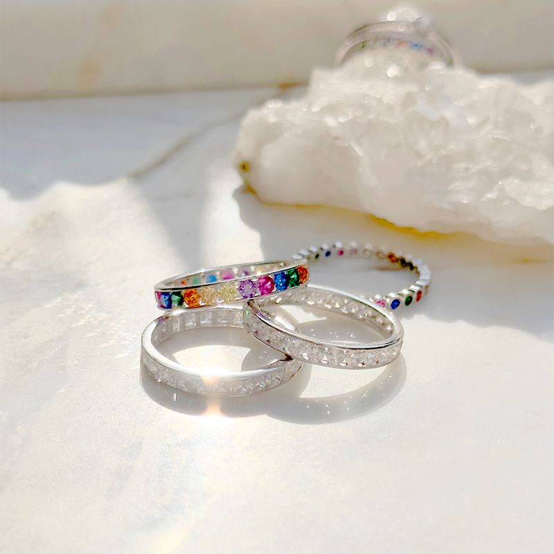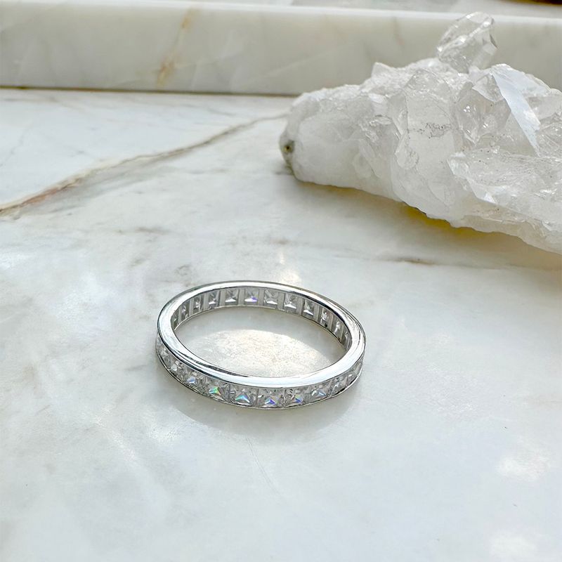 O anel de prata 925 vem com cravação de trilho de zircônias brancas por toda a base.