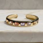 Bracelete elegante com design retangular, delicadamente cravado em cravação inglesa e adornado com cristais de ametista, rodolita e morganita., destacando cristais de ametista, rodolita e morganita. A combinação de pedras preciosas confere um toque sofisticado e vibrante à peça. Ideal para quem busca uma joia única, cheia de beleza e brilho.