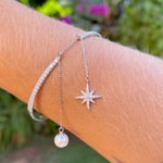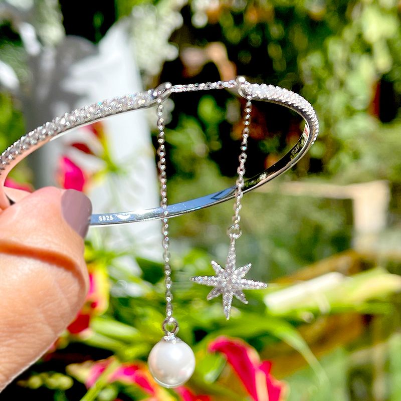 Com um design sofisticado, o bracelete de prata 925 contém pingente de estrela de zircônias brancas e de pérola shell em uma corrente.