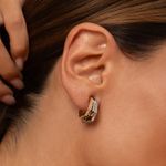 O brinco argola geométrica é aquele modelo nada básico que faz toda diferença! Com metade em ouro 18k e metade em ródio branco, ele cria um contraste super moderno e estiloso. As zircônias brancas deixam o brilho ainda mais especial. Fashion, elegante e perfeito pra quem ama peças com personalidade.