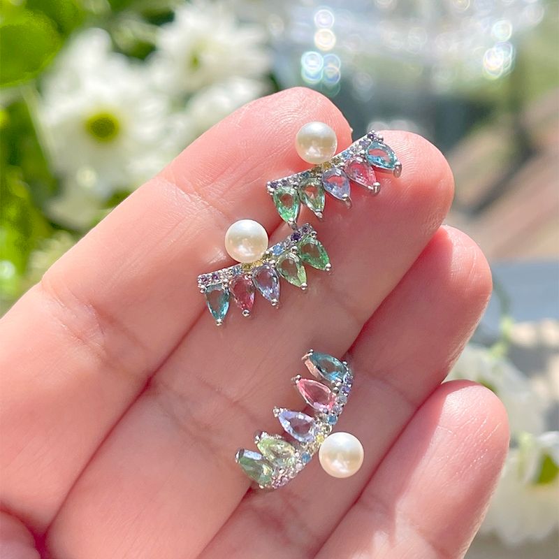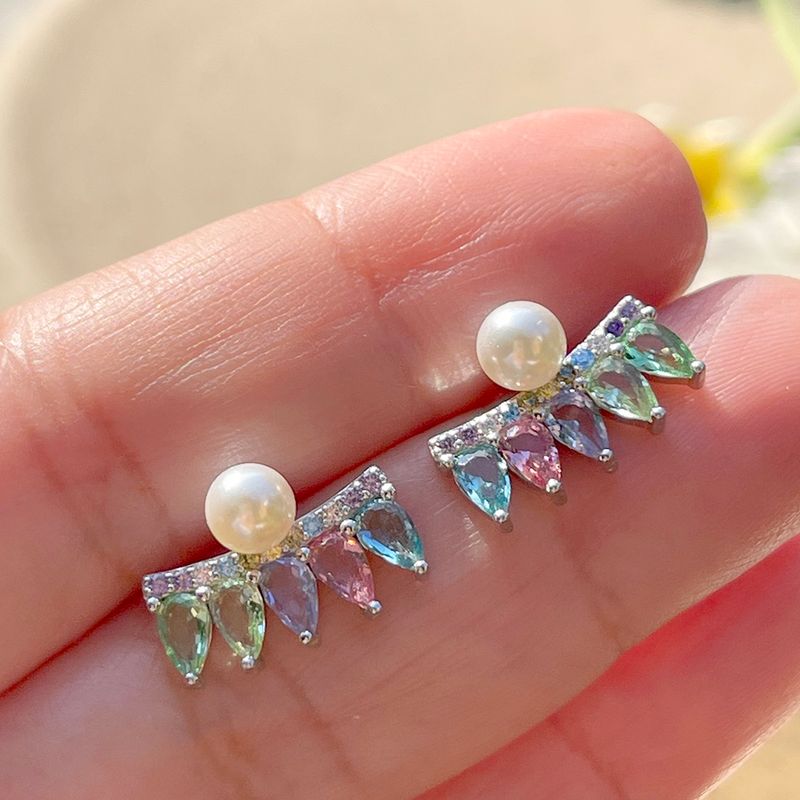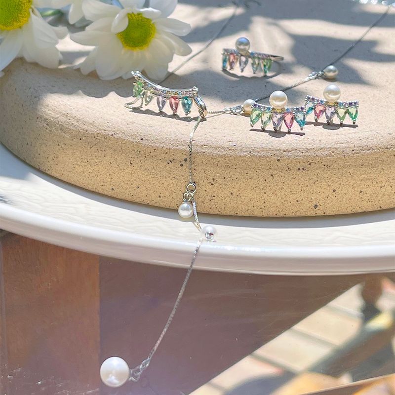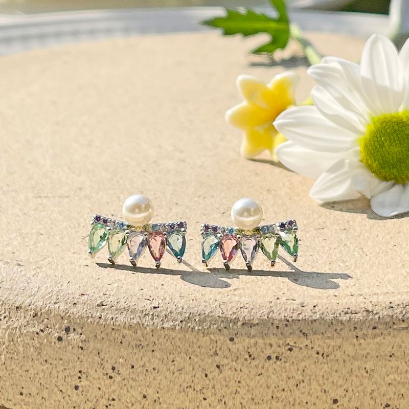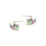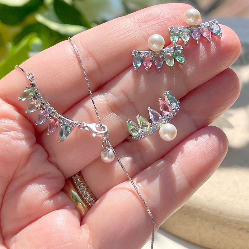 O brinco de prata 925 tem design de cortina com cristais de ametista verde, tanzanita e turmalina rosa. destaque para a pérola e as zircônias coloridas.
