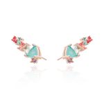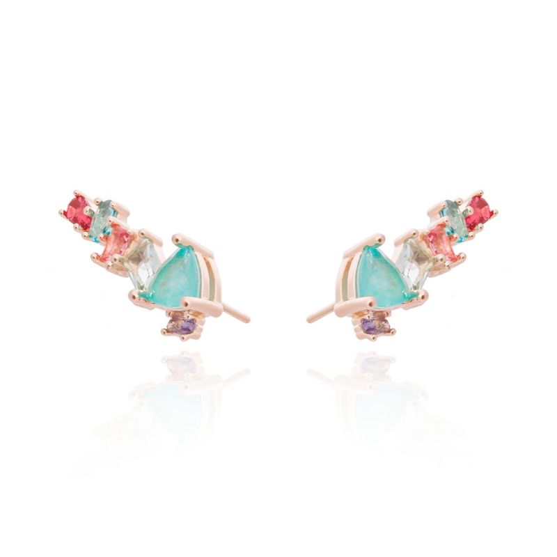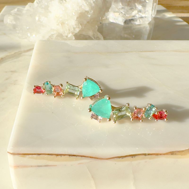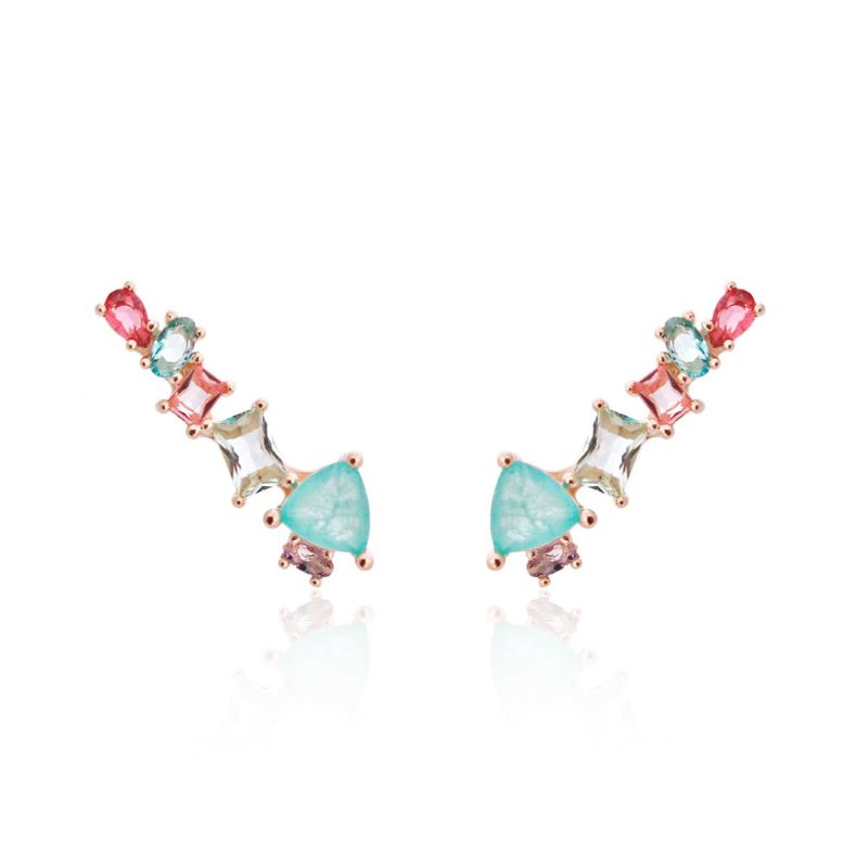 Brinco ear cuff com triângulo de fusion turmalina com cristais de topázio azul, turmalina rosa, quartzo rosa e ametista verde.