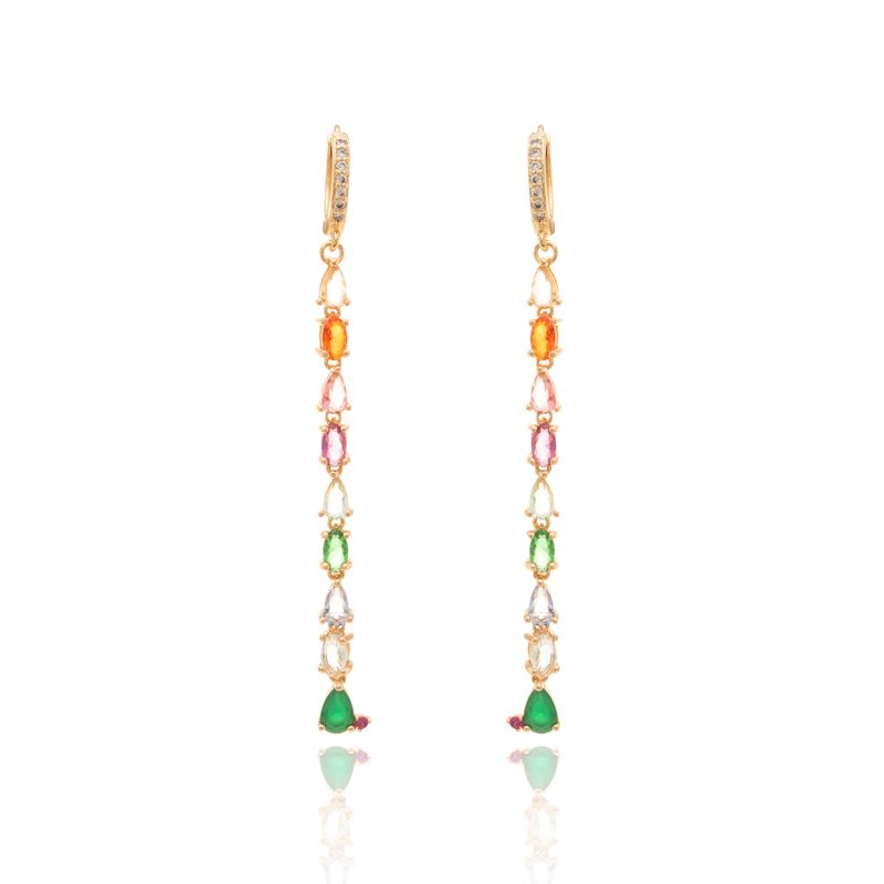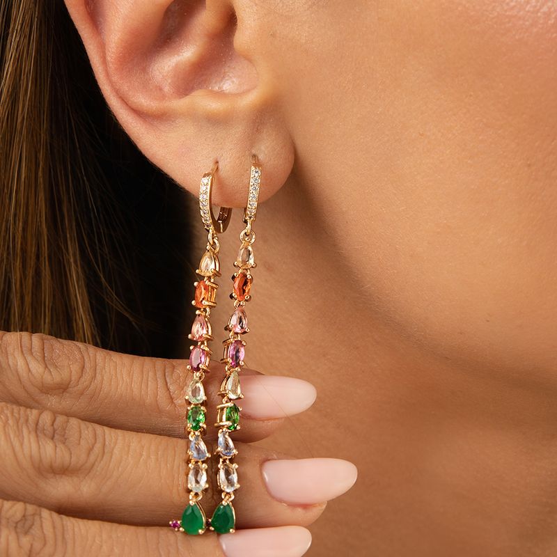 Um brinco pra arrasar com cor e brilho! Cristais Esmeralda, Turmalina Rosa e Podange ganham destaque com zircônias brancas no banho de ouro 18k. Longo, leve e poderoso — o toque perfeito pra iluminar seu look!