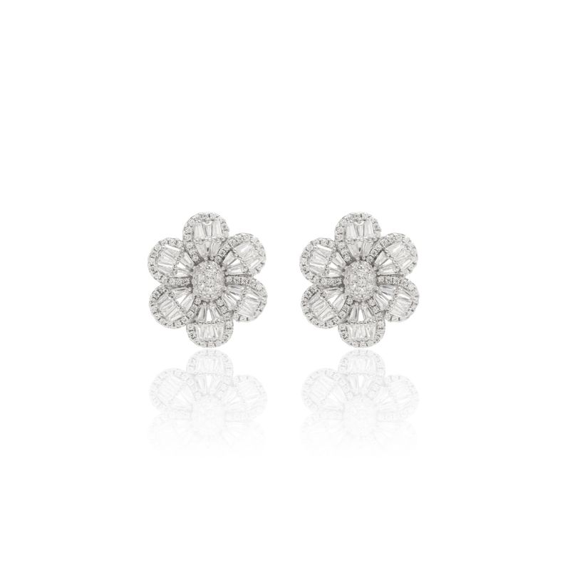 O brinco flor com zircônias brancas baguete é uma peça moderna e elegante. As zircônias brancas, em formato baguete, oferecem um brilho especial que se destaca como o grande diferencial desse acessório.