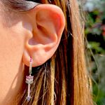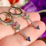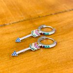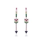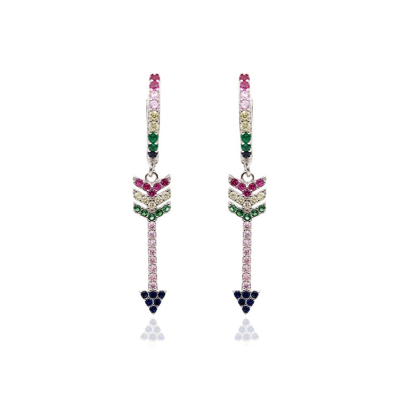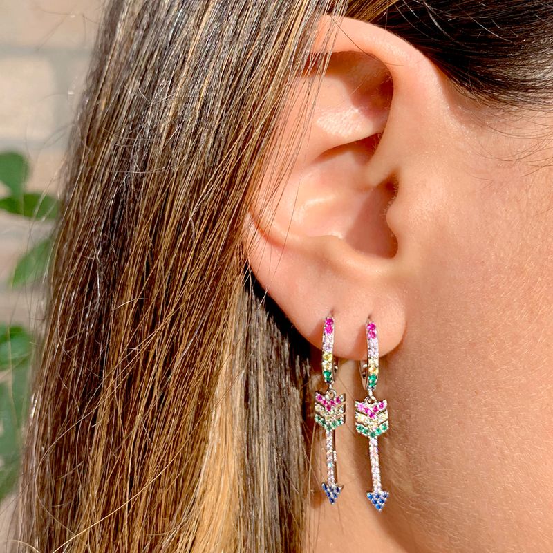 Feminino e moderno, o brinco ear bling contém argola de prata 925 e pingente de flecha cravejado de zircônias coloridas. Pode ser usado no furo principal da orelha ou no segundo furo.
