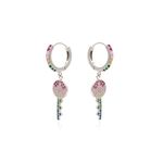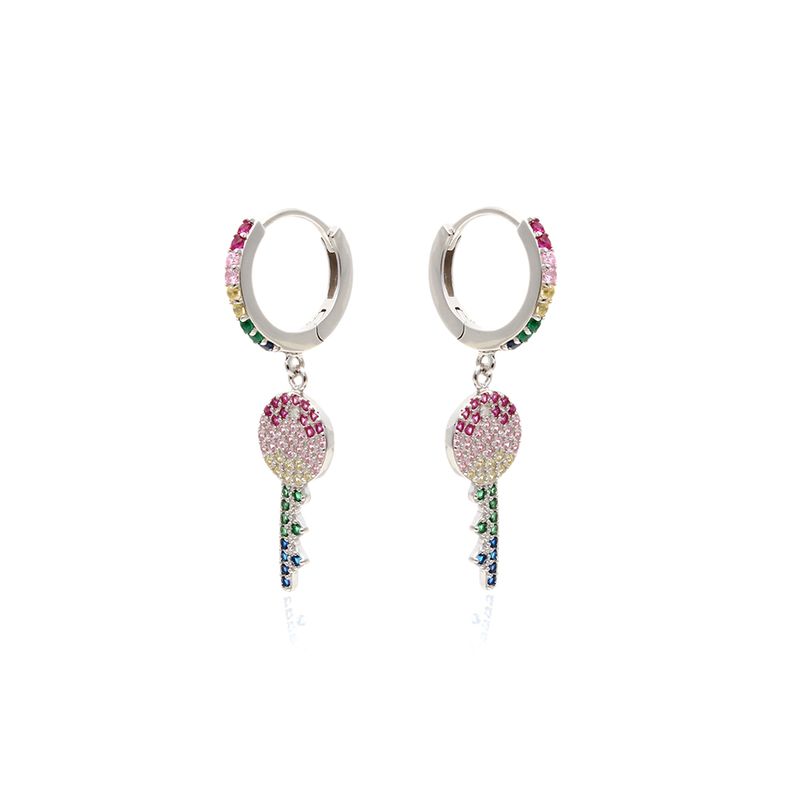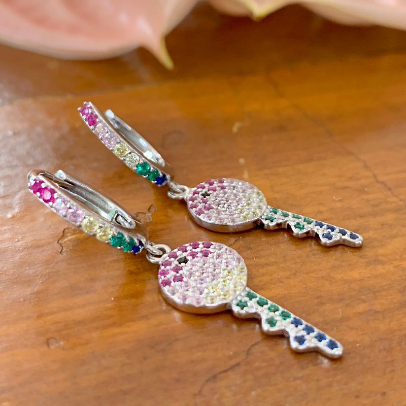 O brinco ear bling tem como proposta a junção de vários acessórios em um único. Nesta coleção, o modelo contém argola de prata 925 com pingente de chave cravejada de zircônias coloridas.