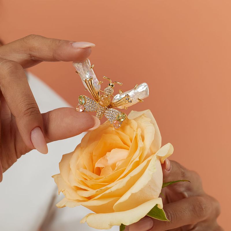O broche bug butterfly é aquele detalhe encantador que transforma qualquer look! Com pérola barroca cheia de personalidade e zircônias peridoto e champagne iluminando as asas, ele mistura delicadeza e brilho na medida certa. O banho de ouro 18k deixa tudo ainda mais luxuoso. Charmoso, moderno e simplesmente irresistível.