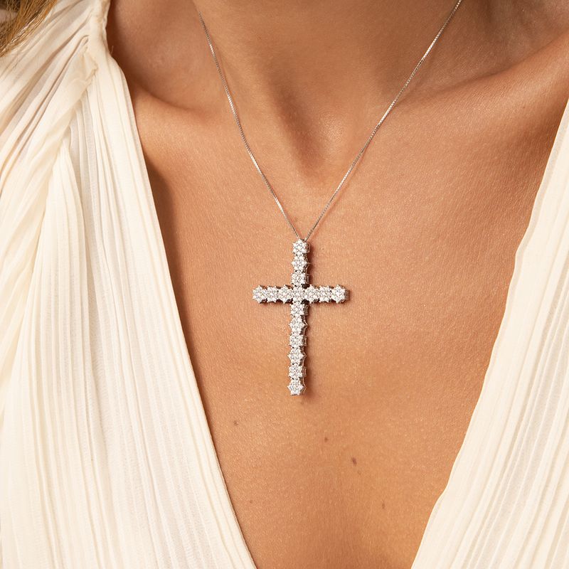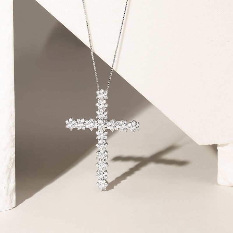 O colar de prata 925 banhada no ródio branco apresenda design de cruz toda cravejada com flores de zircônia branca , corrente veneziana de 50cm com extensor para ajuste em até 40cm e possui fecho lagosta.