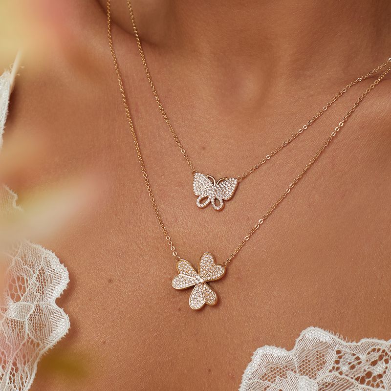 Colar Escapulário Borboleta e Trevo com Zircônias Brancas 68cm - Banho de Ouro 18k