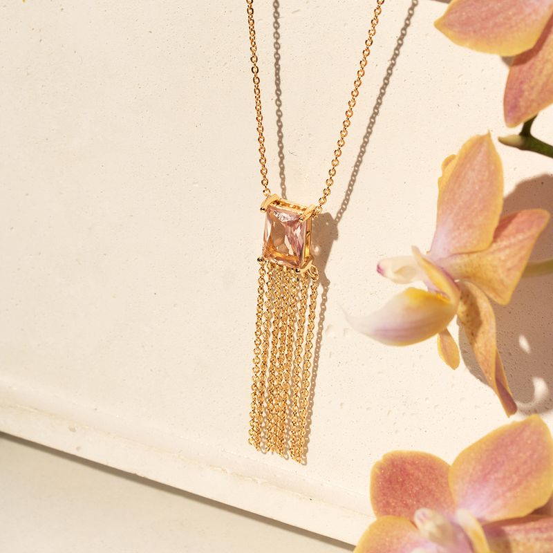 O colar retangular de cristal rodolita com franja traz um visual elegante, moderno e cheio de movimento. O cristal rosado destaca um brilho sofisticado, enquanto a franja alongada deixa a peça ainda mais charmosa e estilosa. Com 55cm, ele tem caimento leve e marcante, perfeito para quem ama acessórios femininos, iluminados e com presença no look.