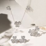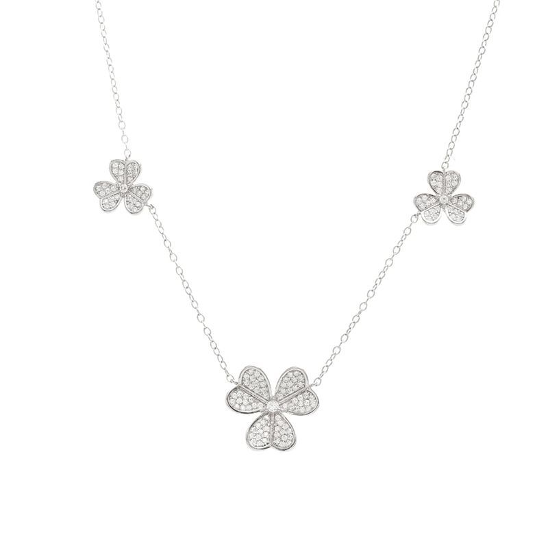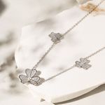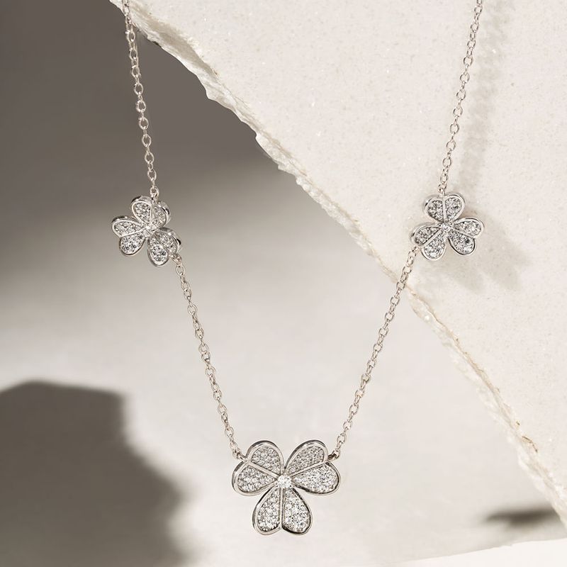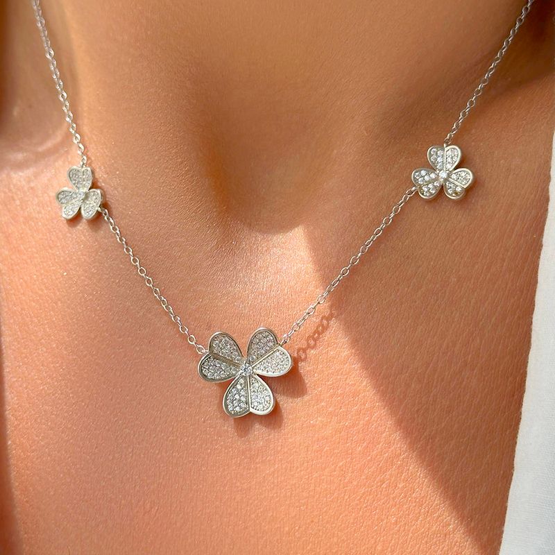 O Colar Trevos com Zircônias Brancas, feito em prata 925, é uma peça delicada e charmosa. Traz pequenos trevos adornados com zircônias brancas, uma corrente de elos redondos e fecho lagosta, combinando brilho e elegância ao design.