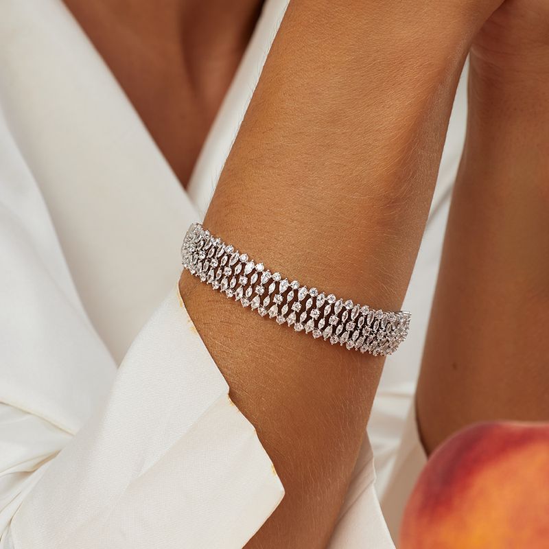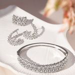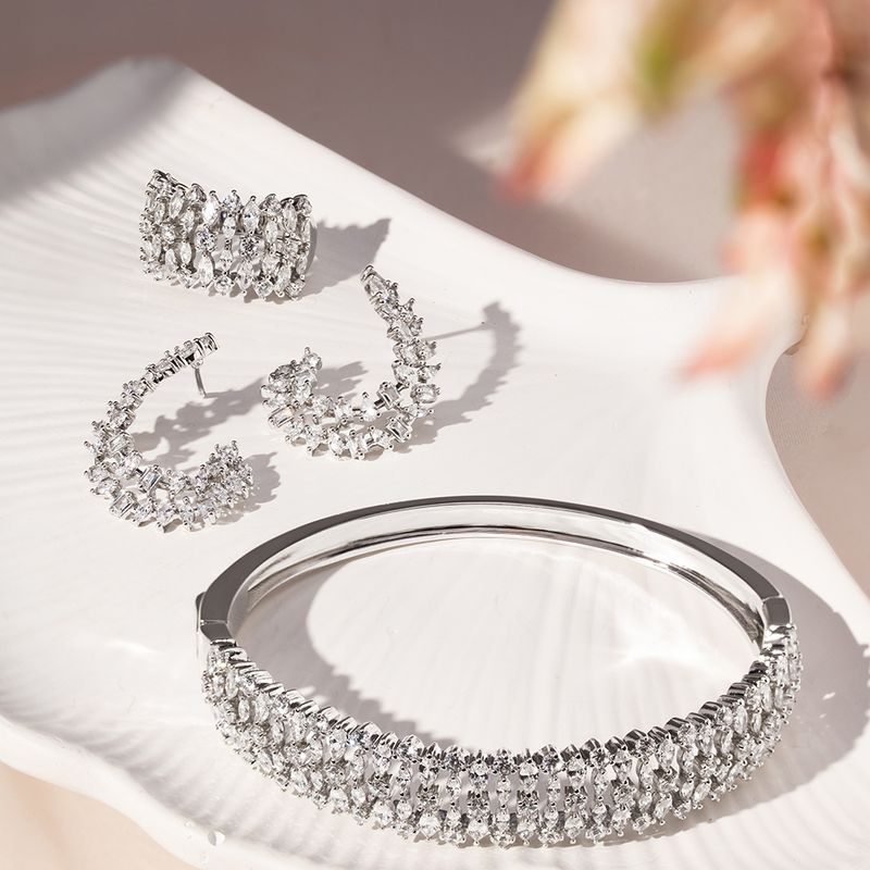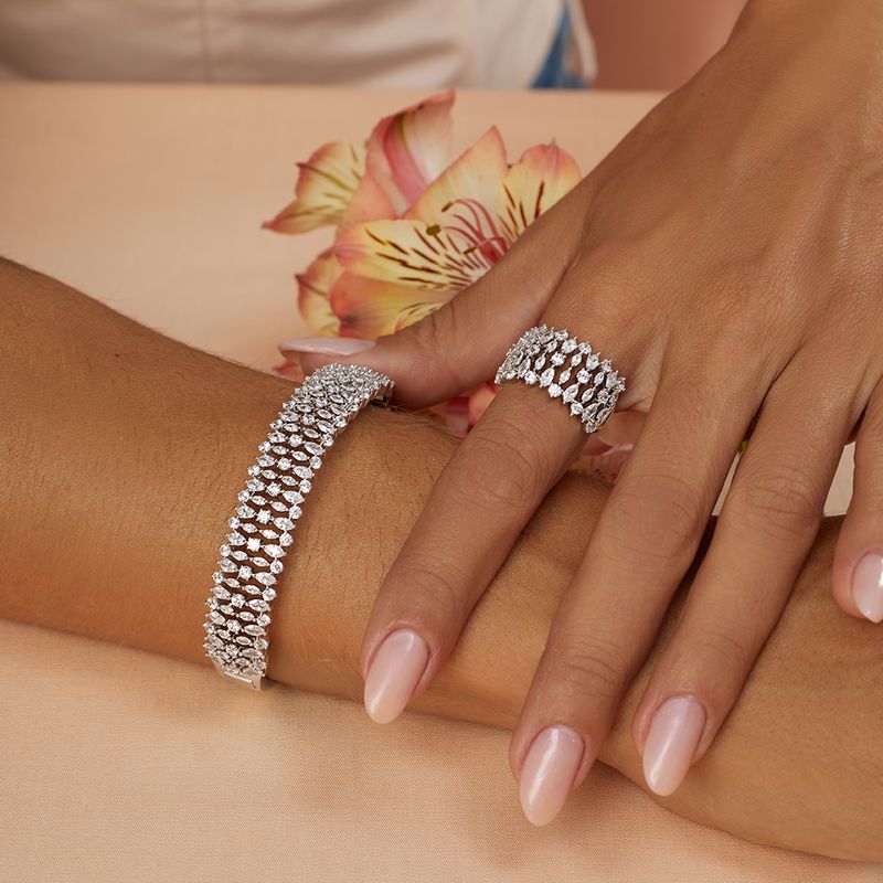 O conjunto cravejado de navetes e zircônias brancas é aquele brilho poderoso que transforma qualquer look! Com banho de ródio branco, ele vem com brinco, anel e bracelete combinando perfeitamente. As navetes criam um desenho super elegante e as zircônias deixam tudo ainda mais iluminado. Moderno, marcante e simplesmente deslumbrante!