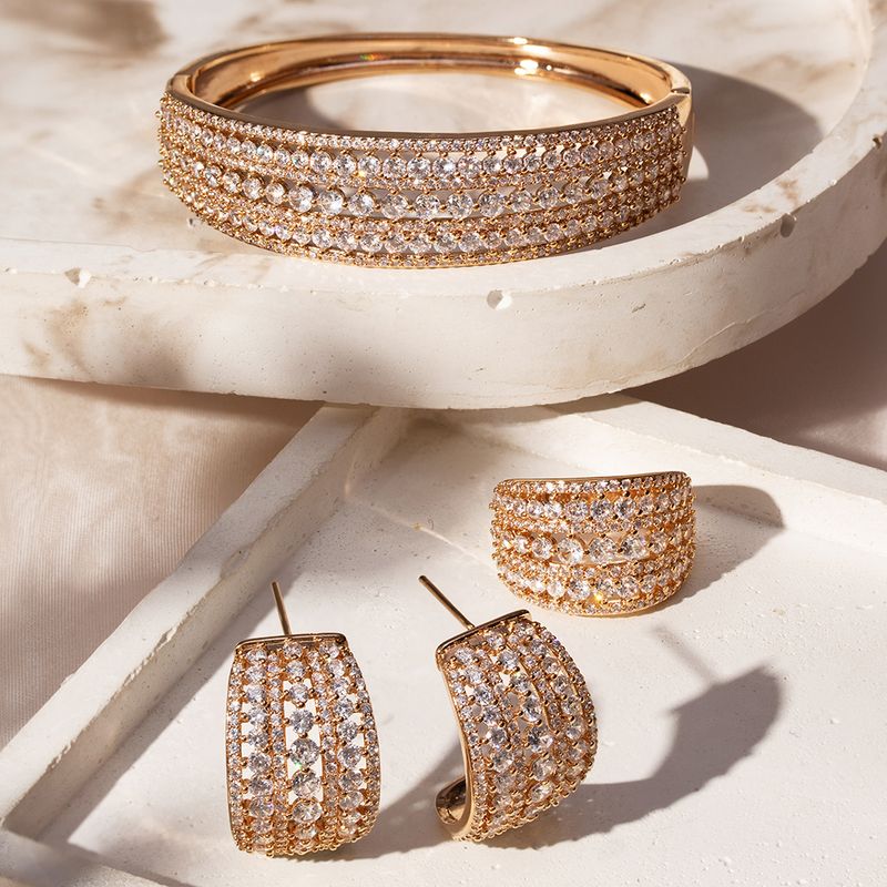 O conjunto brinco, anel e bracelete inteiro cravejado é aquele brilho poderoso que transforma qualquer look! Todo em zircônias brancas e com banho de ouro 18k, ele entrega luxo, presença e muito glamour. Moderno, impactante e perfeito pra quem ama peças que chamam atenção na medida certa.