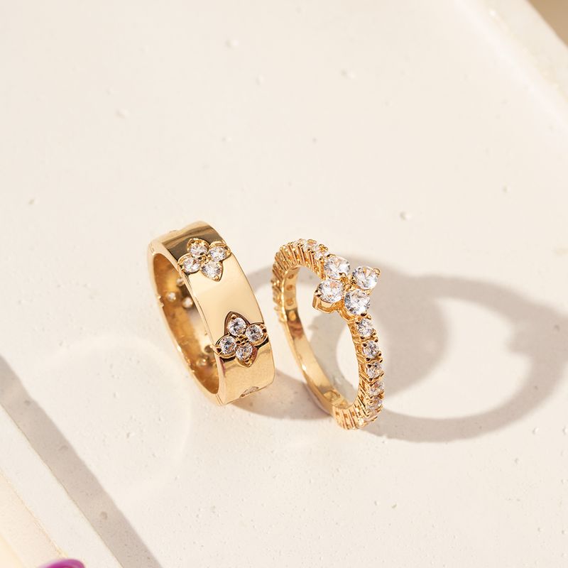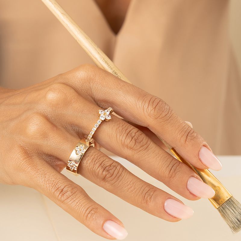 Dois anéis pra florescer com estilo! As florzinhas com zircônias brancas brilham lindamente no banho de ouro 18k. Leves, modernos e supercharmosos — perfeitos pra combinar e arrasar!