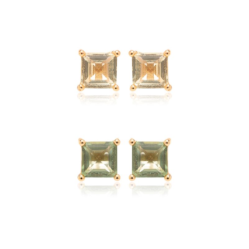 O brinco em banho de ouro 18k vem em um kit com dois pares quadrados 5x5 super charmosos. Um par com cristal citrino amarelo luminoso e outro com cristal ametista verde elegante. Pequenos, delicados e cheios de brilho, são perfeitos para dar um toque de cor e estilo ao visual.