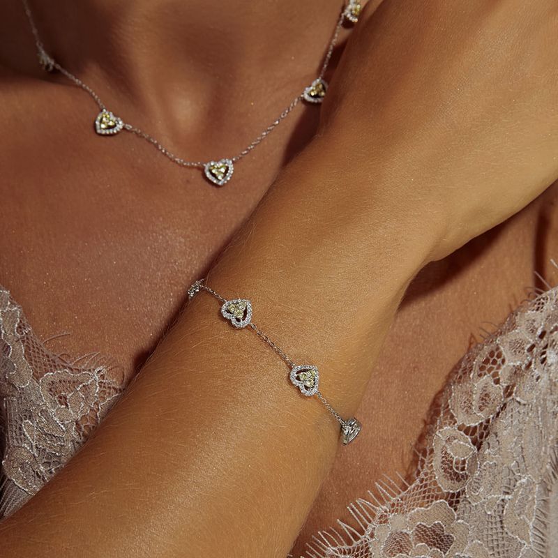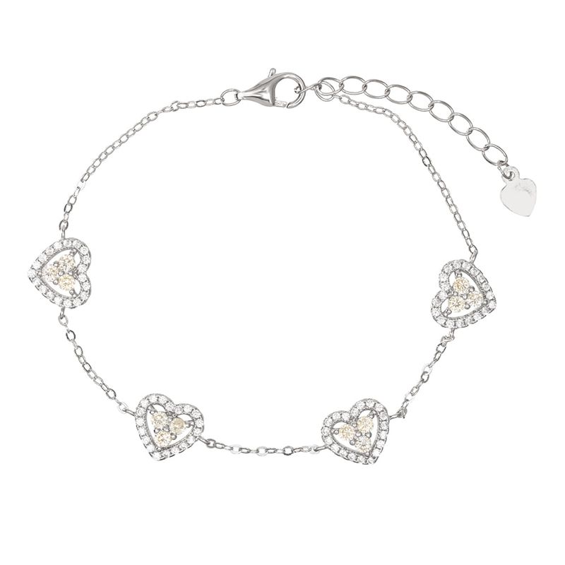 Pulseira Corações Cravejados com Zircônias Fancy Yellow e Zircônias Brancas 19cm - Prata 925