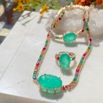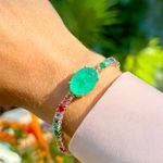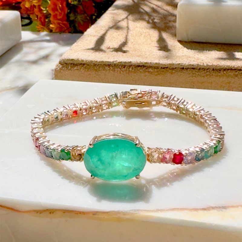 Pulseira cravejada com fusion esmeralda oval e cristais de rubi, quartzo rosa, paraíba, topázio fumê e topázio azul.