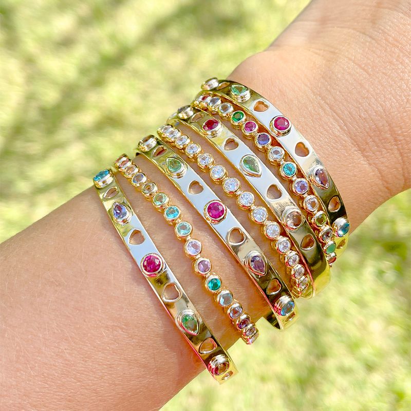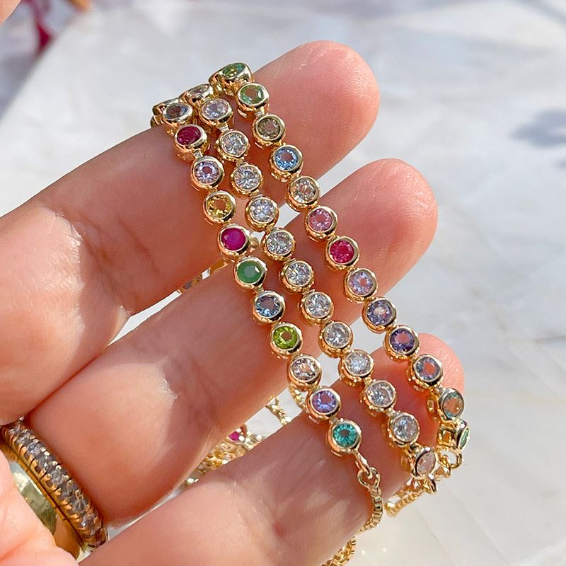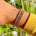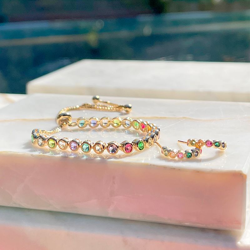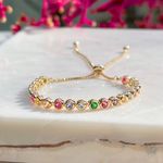 A pulseira banhada a ouro 18k contém cristais de rubi, esmeralda e peridoto no formato de bolinhas. Possui ainda fecho regulável para ajustar perfeitamente no pulso.