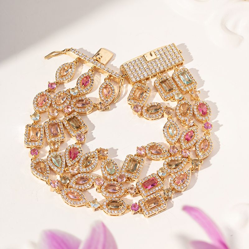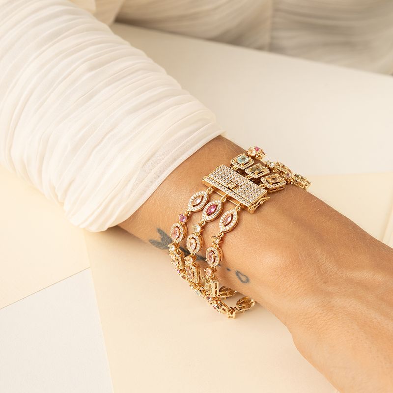 A pulseira perfeita para quem ama cor, brilho e elegância! A Pulseira Formas Maxi traz uma combinação luxuosa de cristais Turmalina Rosa, Topázio Azul e Rodolita, acompanhados de zircônias brancas que iluminam o design. Com banho de ouro 18k e 17,5cm de comprimento, é uma peça marcante, moderna e sofisticada — pura expressão de estilo e leveza.