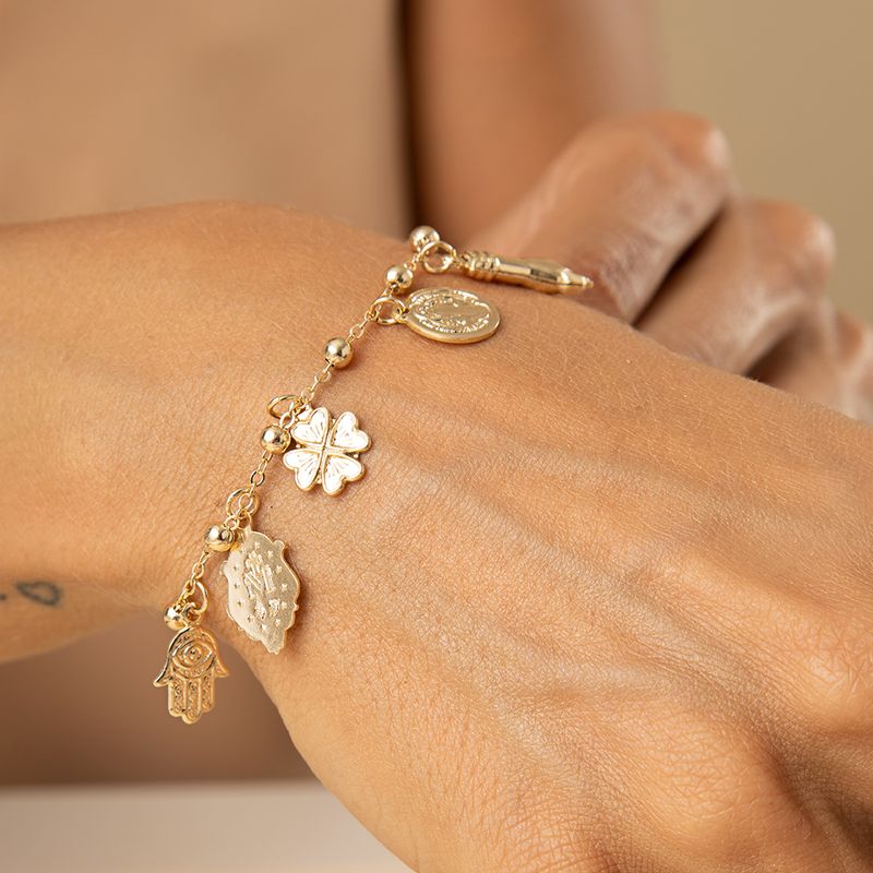 pulseira Patuá Lisa é uma joia repleta de significado e proteção! Com pingentes de Mão de Fátima, Nossa Senhora das Graças, Trevo, São Bento e Figa, ela representa fé, sorte e boas energias. Seu design liso e elegante realça o brilho do banho de ouro 18k, trazendo um toque sofisticado e moderno ao visual. Com 19cm, possui caimento leve e confortável, ideal para o uso diário ou para compor mix de pulseiras. Uma peça charmosa e simbólica, perfeita para quem busca beleza, espiritualidade e estilo em um único acessório.